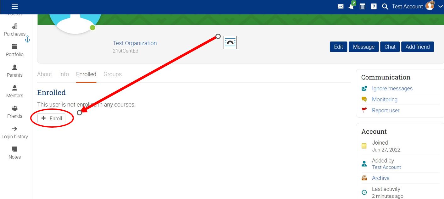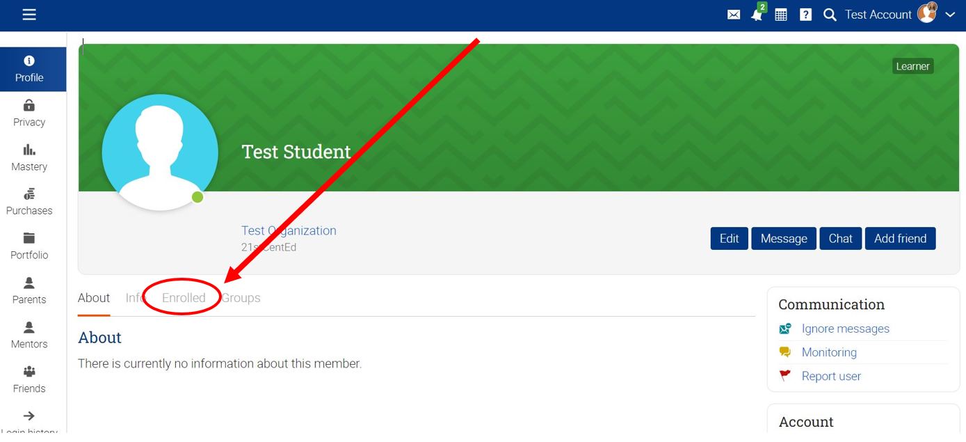 - Click on the “Enrolled” tab located in the center content underneath the student’s name.
