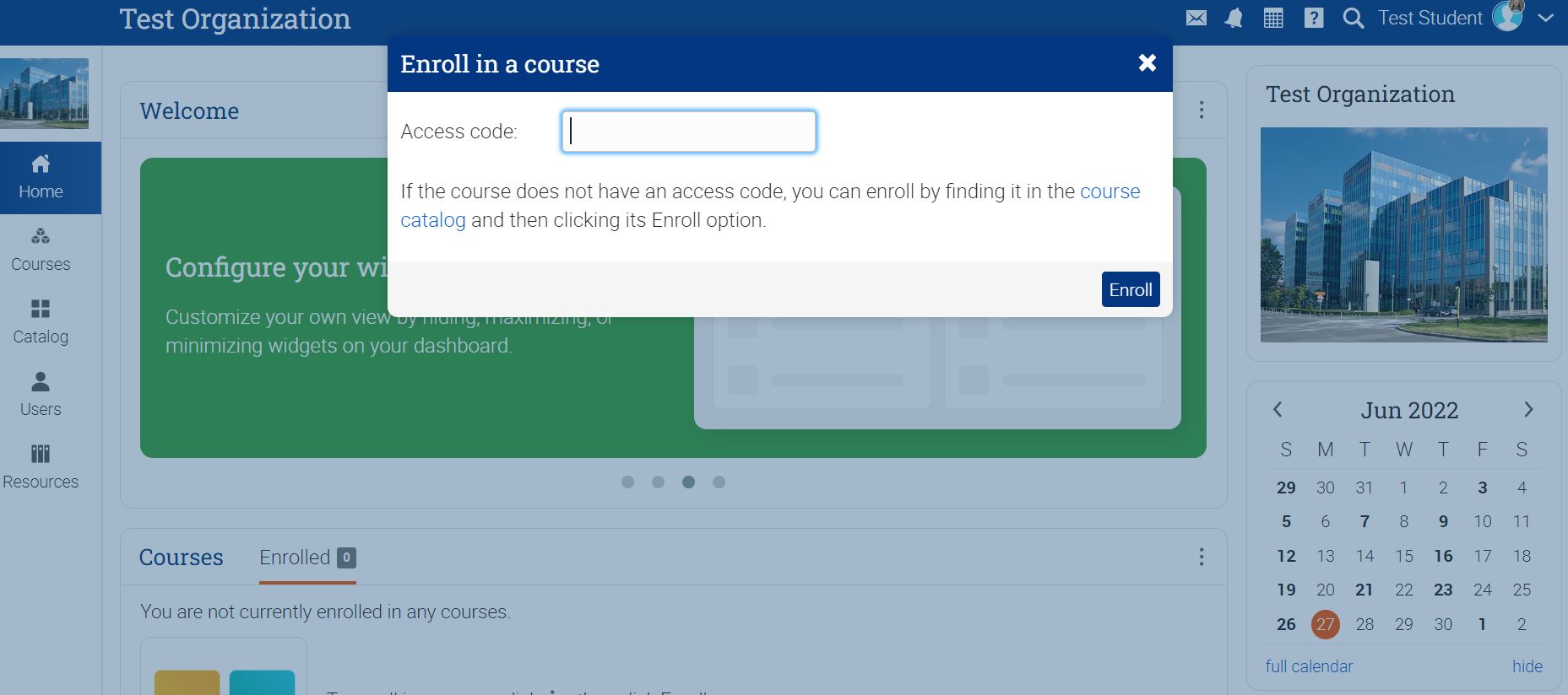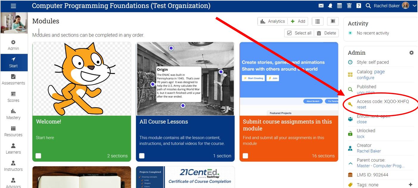 - Access code: Each course has a unique code that will allow each student to enroll themselves into your course.
