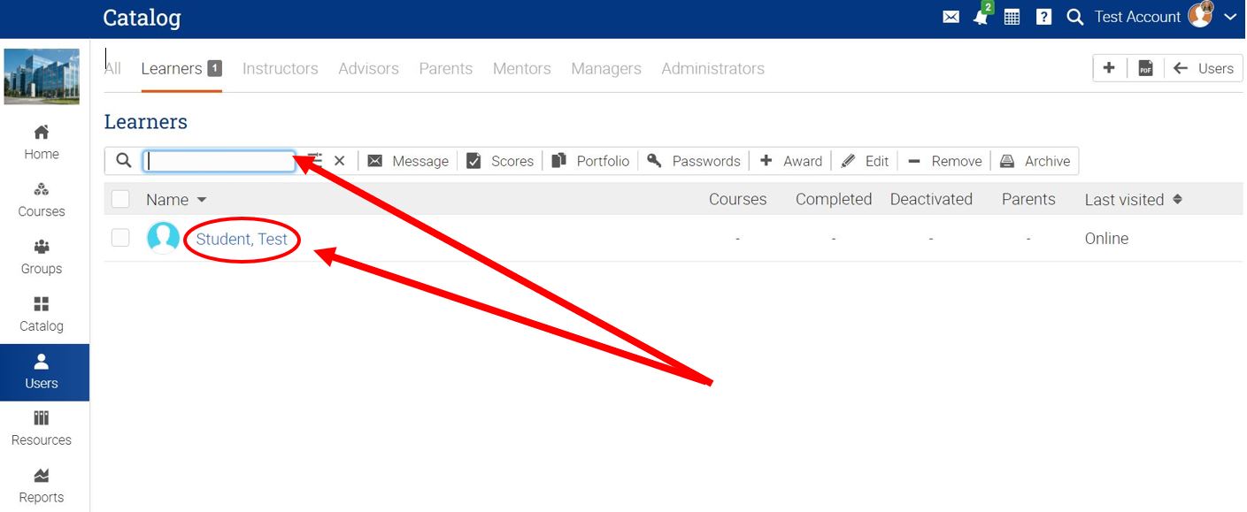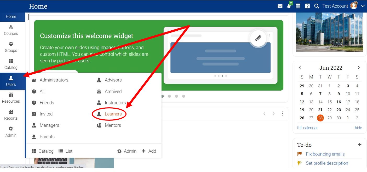 - Hover over the “Users” tab in the left-hand toolbar, click on “Learners.”
