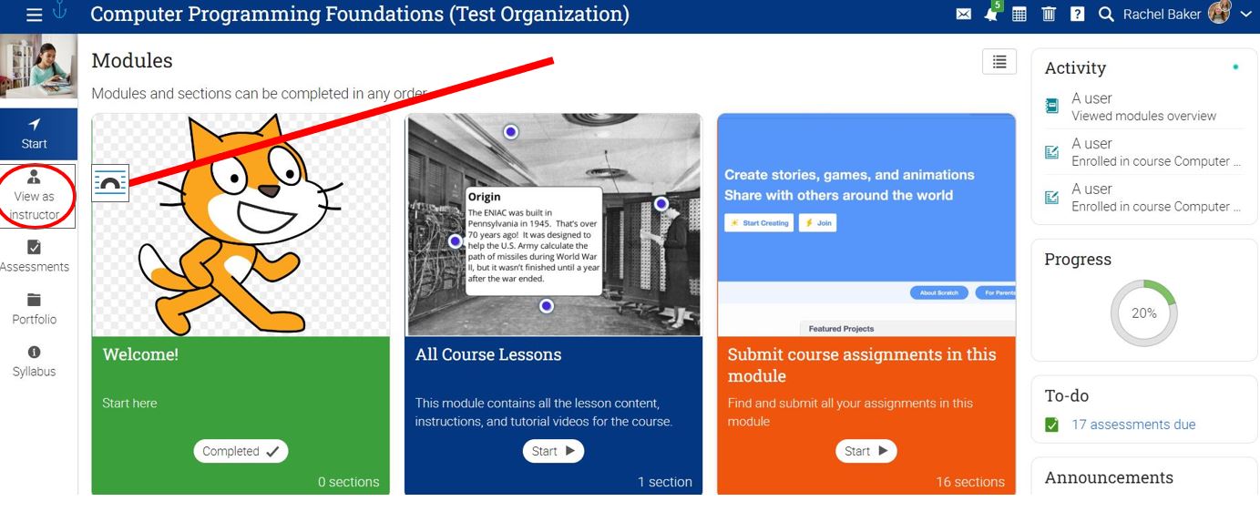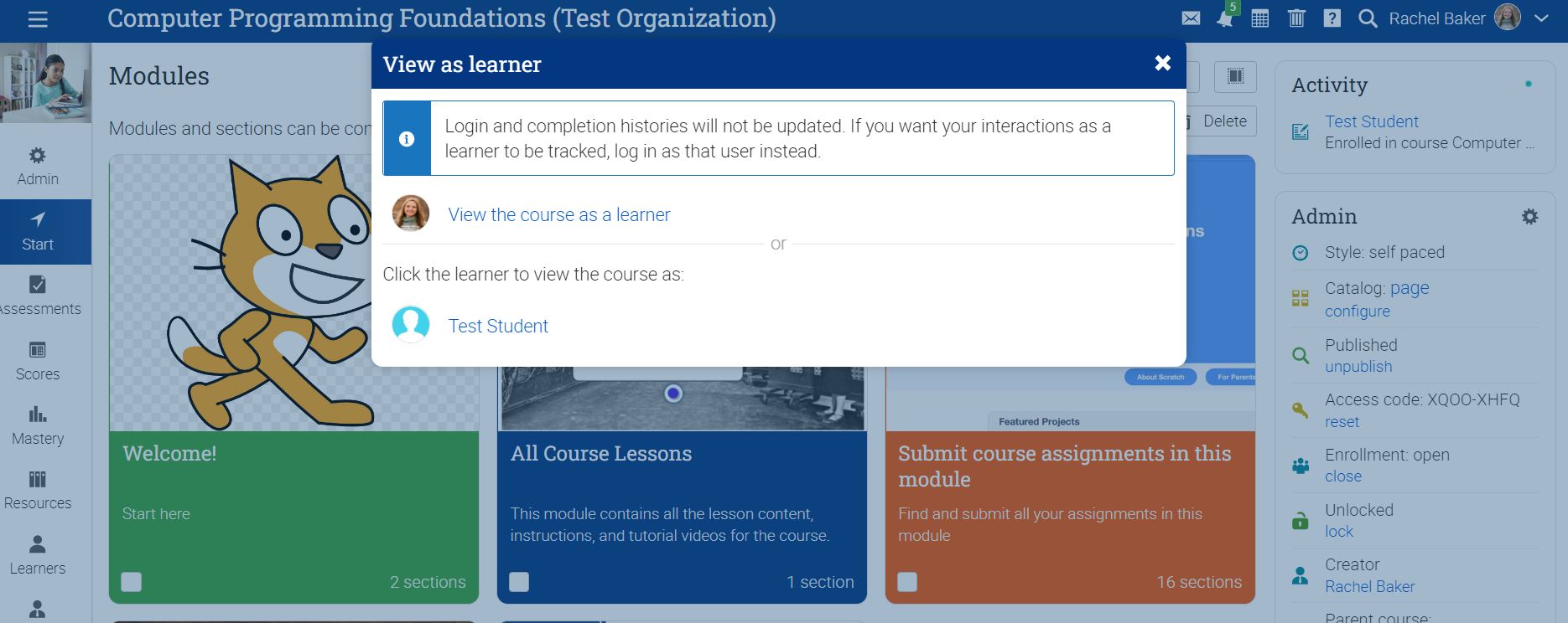 - Choose to “View the course as learner” or select a specific student to view the course as.