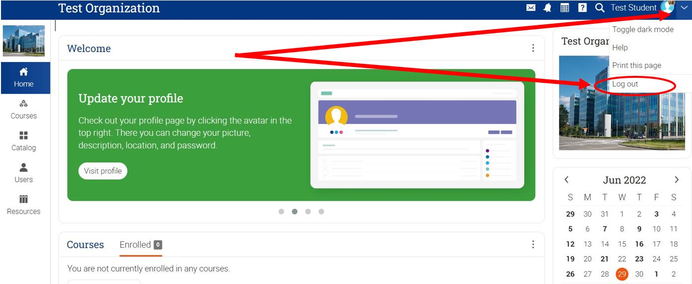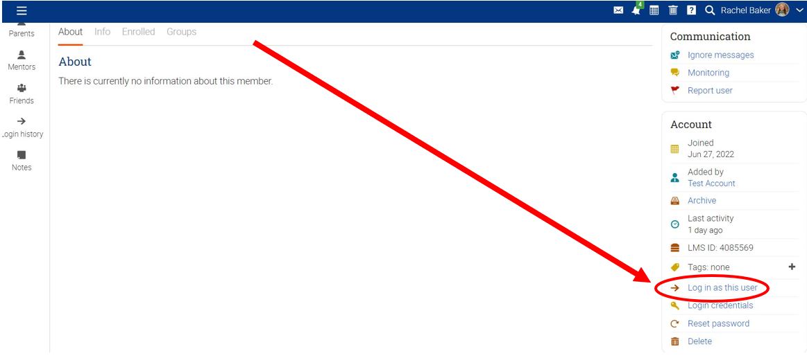 - You will now be logged in directly as that student, be sure to logout (top right corner) if you wish to go back to your own account.