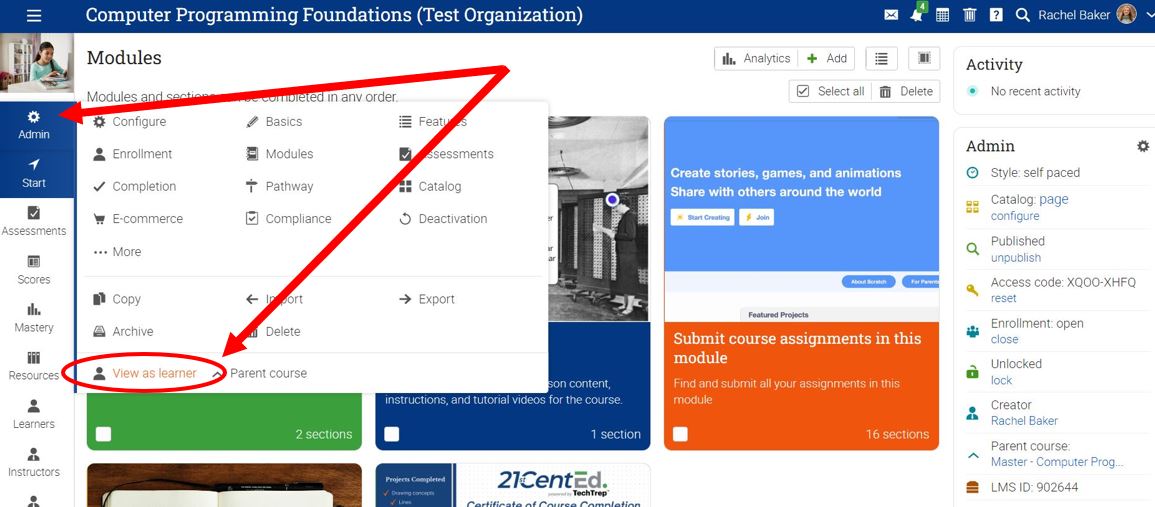 - Hover over the “admin” button on the top left-hand toolbar, click on “view as learner.”