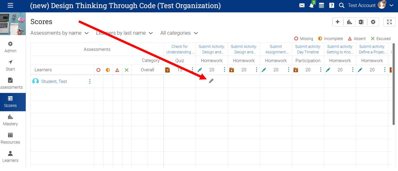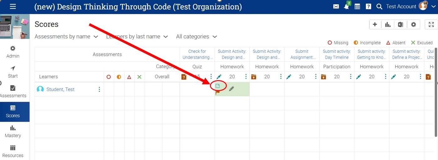 - Each assignment that has a submission will have a pencil icon inside the box if it needs to be graded, and a score if it has already been graded.
